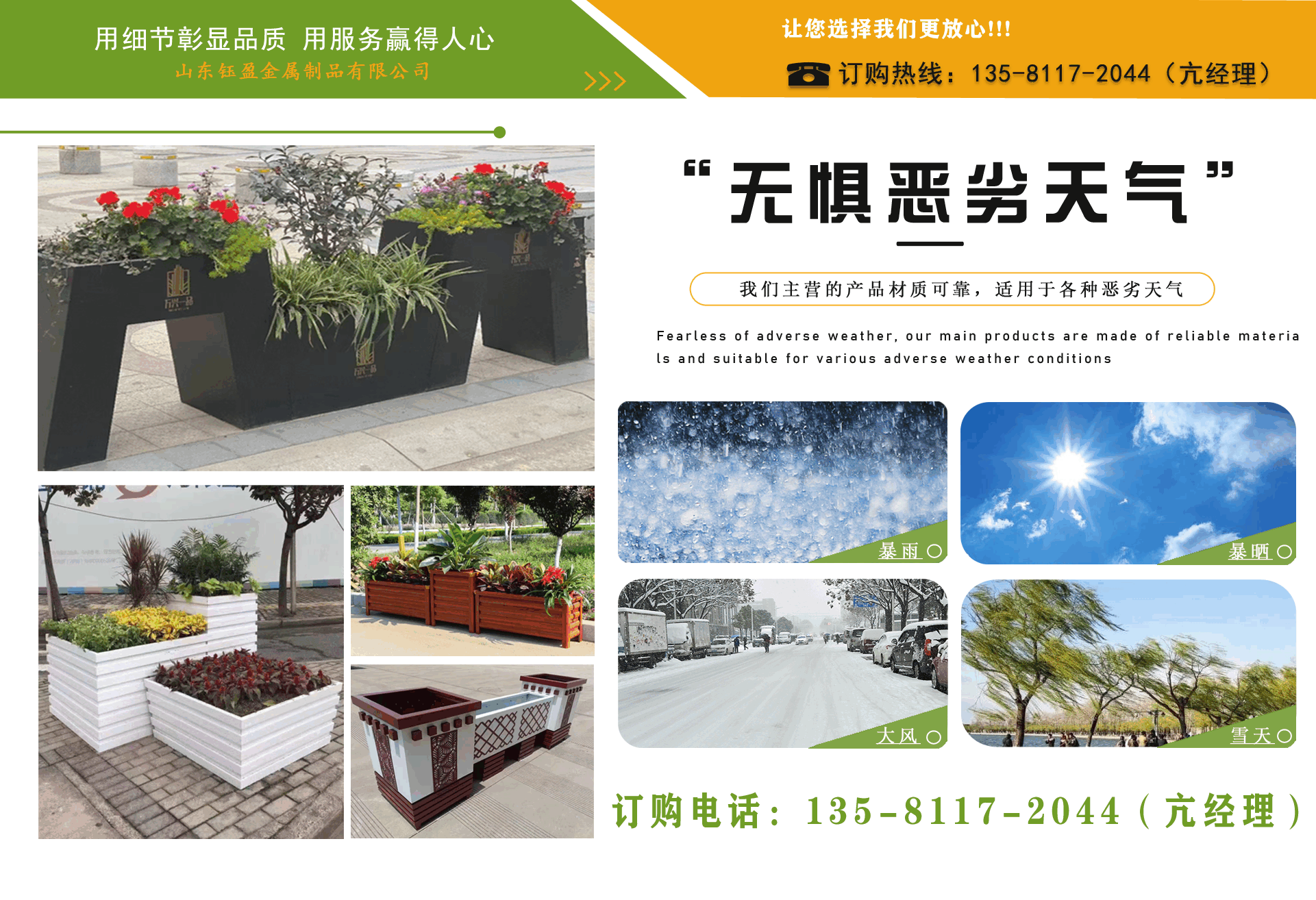 山東鈺盈金屬制品有限公司主營鍍鋅板花箱,道路隔斷花箱,定制花箱,戶外道路花箱,花箱座椅等產品,產品結構合理、性能優良,具有強度高、耐腐蝕、抗老化、隔熱隔音、節約能源、外形美觀、使用壽命長等優點,深受國內外客戶認可?! ∥覀兏鶕蛻羲诔鞘械奈幕卣?,制造出符合當地城市文化氣息的自然立體、觀賞性強的花箱產品成為城市里一道靚麗的風景線。 公司實行誠實、公正、守信、價格合理、平等互利?! 」緫{借雄厚經驗實力,恪守誠信為本的原則,得到了眾多客戶的信賴,并在業界獲得良好的口碑。建立了穩固的合作關系,隨著業務的不斷發展和壯大,合作伙伴的范圍也在不斷擴大。我們熱情盼望與您的合作,為社會的可持續發展獻上一份努力。...